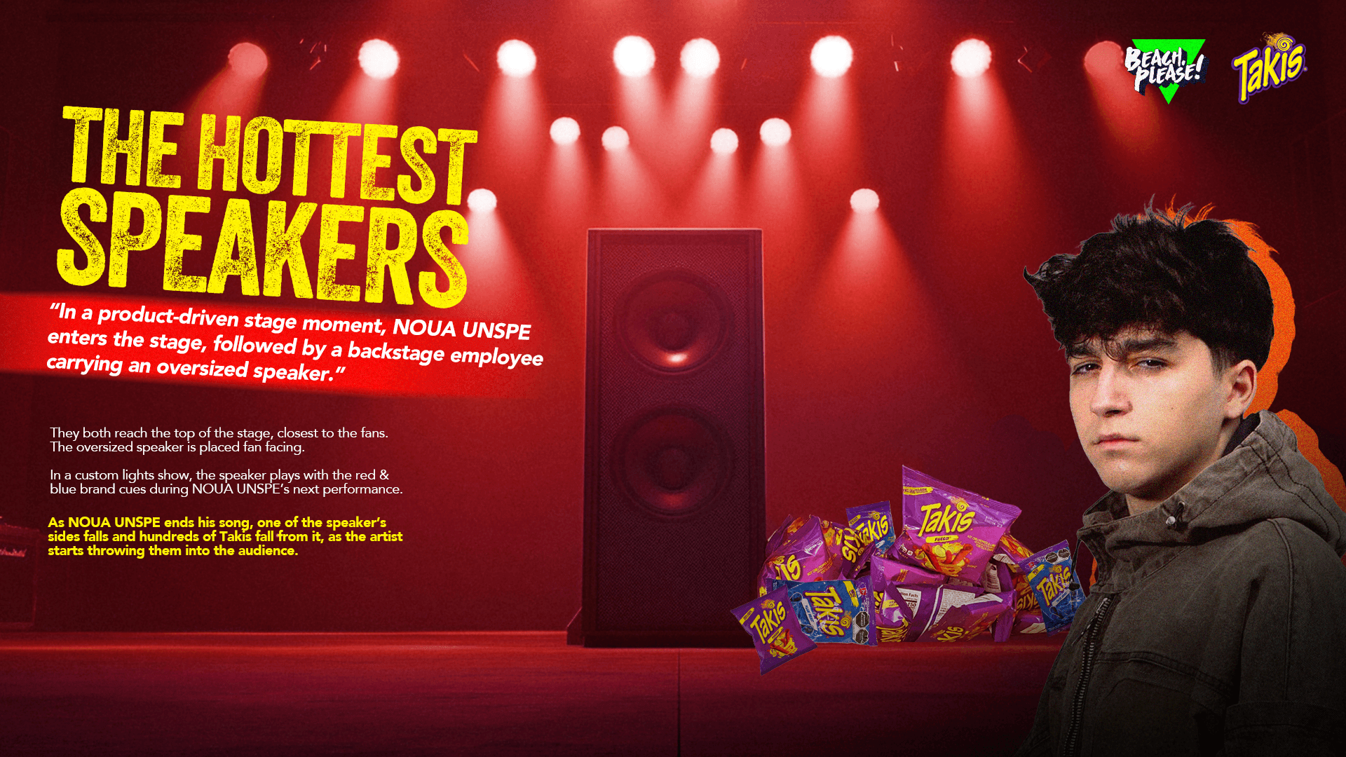 As one of the main sponsors of the music festival, Beach, Please!, Takis had an integrated campaign for the show. Online and offline communication, contests for free tickets, on-site space activations and one main stage moment with an artist.